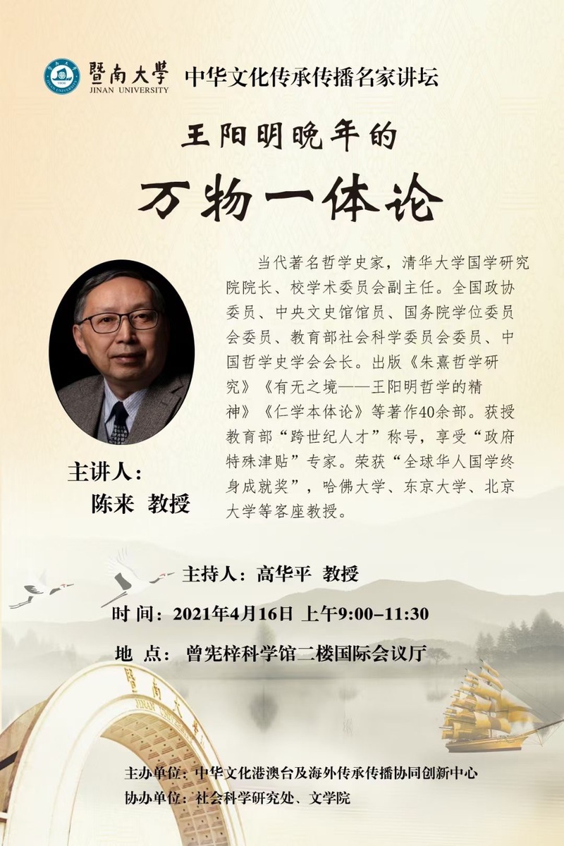 中華文化港澳臺及海外傳承傳播協同創新中心于2020年9月被教育部認定為省部共建協同創新中心。為打造國內一流、國際知名的學術交流平臺,推動中華文化內涵、傳承傳播形式和策略的深入研究,中心開設高端學術系列講座“中華文化傳承傳播名家講壇”,啟動儀式定于4月16日上午9點在暨南大學曾憲梓科學館二樓國際會議廳舉行。儀式結束后,將舉辦首場講座,信息如下: